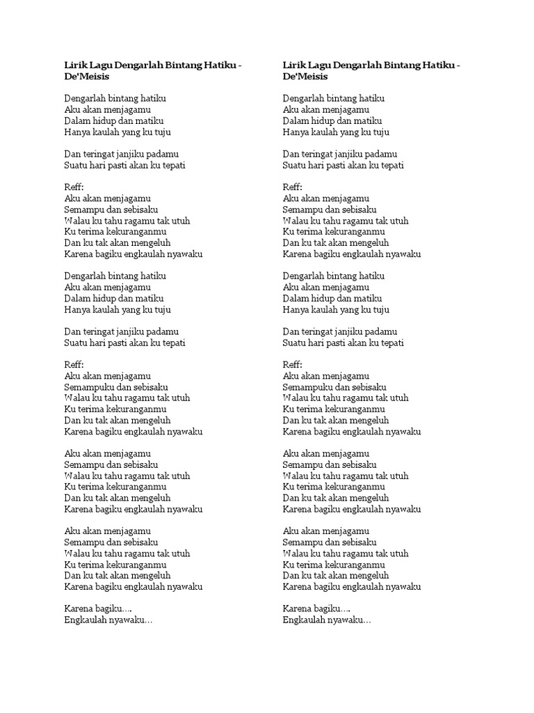 Lirik Lagu Jiwang Lirik Lagu Dengarlah Bintang Hatiku Drpd Kumpulan Demeises Dengarlah Bintang Hatiku Aku Akan Menjagamu Dalam Hidup Dan Matiku Hanya Kaulah Yang Ku Tuju Dan Teringat Janjiku Padamu Suatu
