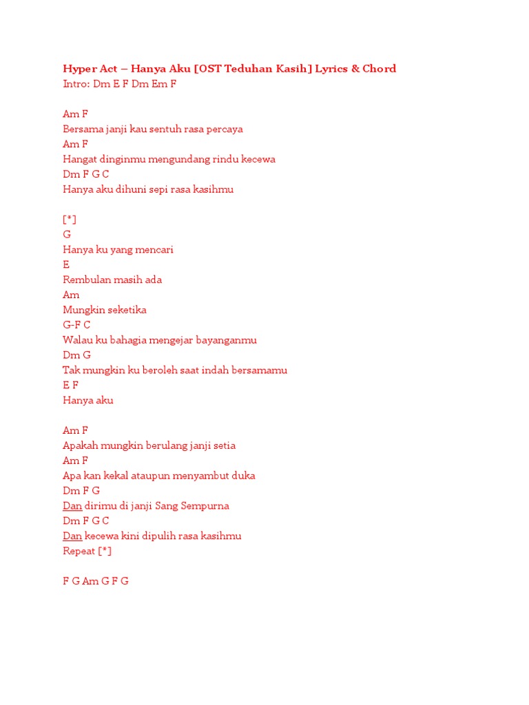 Hyper Act Hanya Aku Ost Teduhan Kasih Lyrics Chord